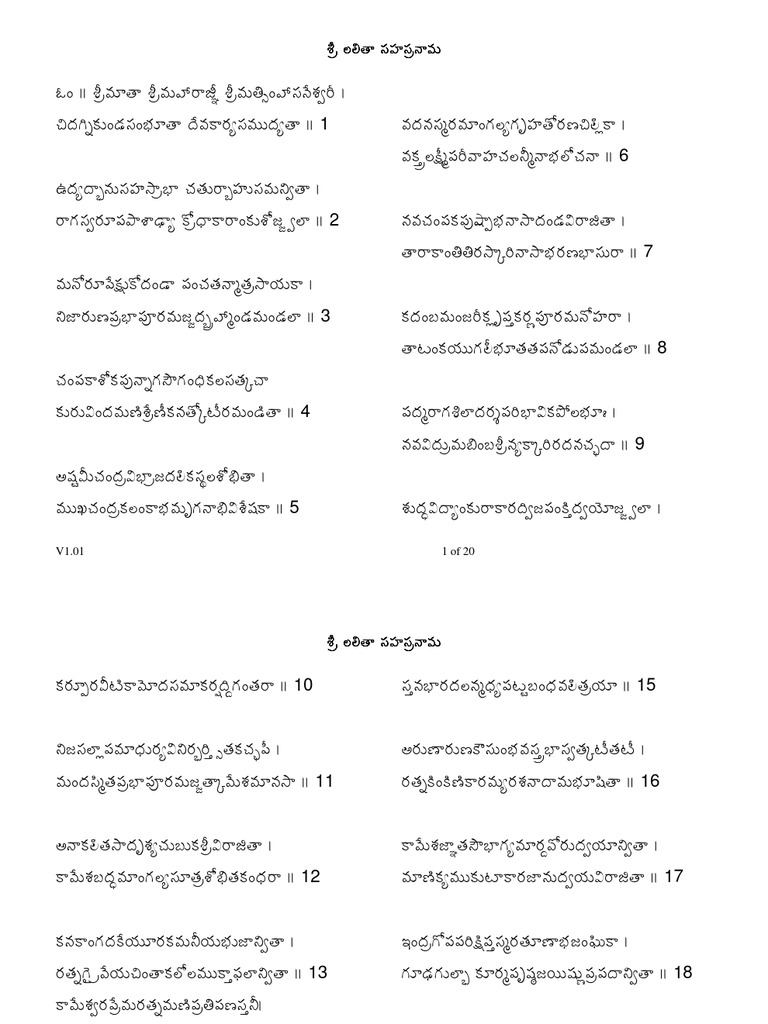 It is a sacred text to the Hindu worshippers of the Goddess Lalita Devi. Pages from 190 to 207 are missing in the pdf copy. Lalita Sahasranama is a Hindu text from the Brahmanda PuranaA principal text of Shakti worshipers it names the goddesss various attributes in the form of names organized in a hymn.